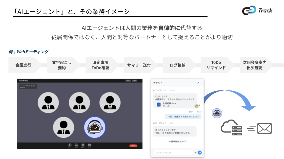 AIエージェントとは、ユーザーのシンプルな指示から、業務を自動的に細分化し、必要な情報を補完しながらタスクを遂行するAIシステムのことです。