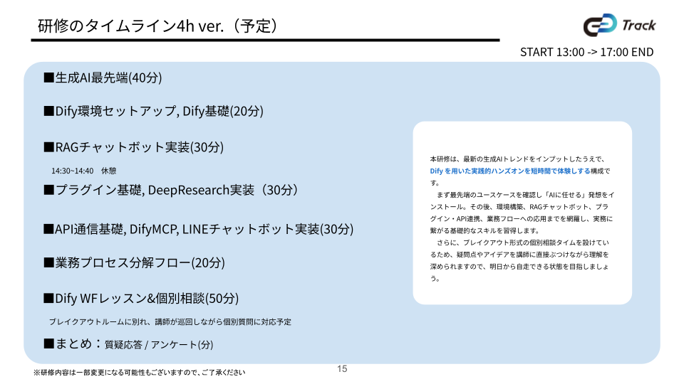 「Dify活用実践」公開講座のカリキュラム(4時間)