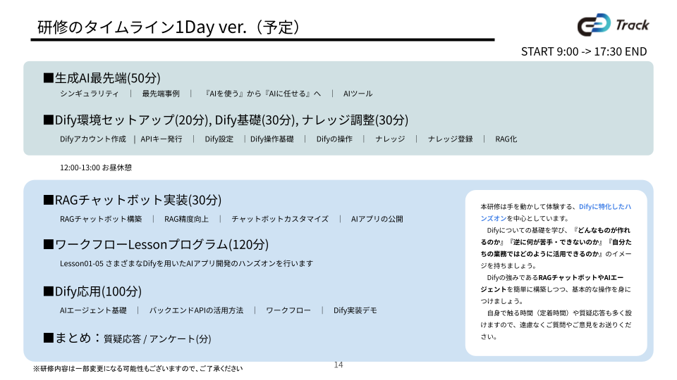 「Dify活用実践」公開講座のカリキュラム(1日間)