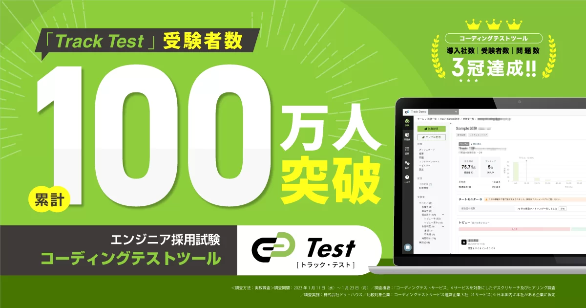 そしてこの度、6月16日に受験者数100万人を突破。累計100万件以上もの採用選考においてTrack Testをご活用いただきました。今後も、企業の採用力強化や、候補者および組織内のスキル可視化を支援するプラットフォームとして、機能拡充とサービス向上に努めてまいります。