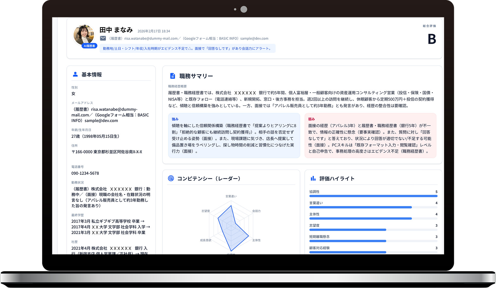 スカウトからスクリーニング、面接、評価までをAIが一貫して最適化。候補者データと評価結果をもとに、再現性のある判断を支援し、採用の精度とスピードを同時に向上。