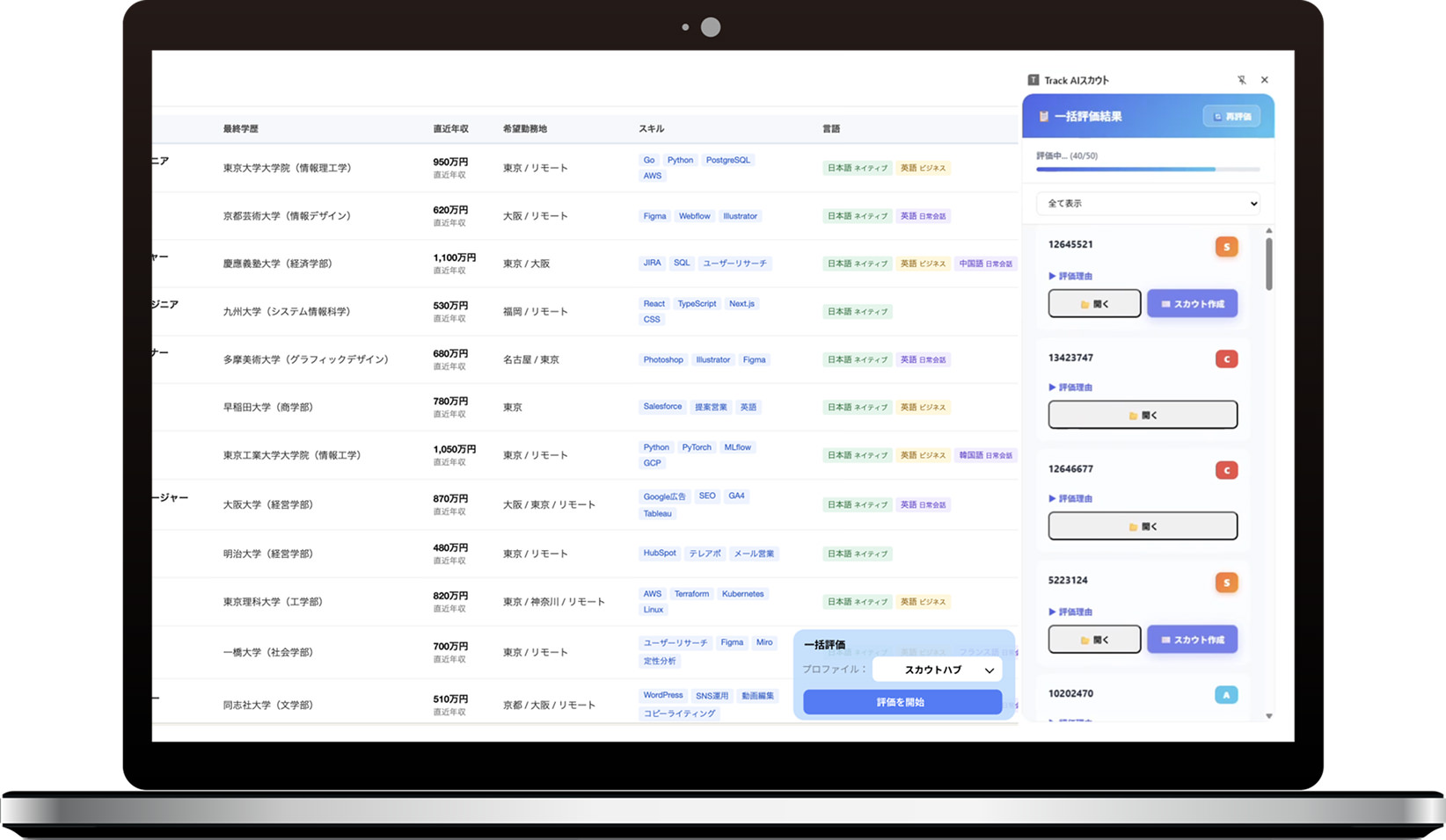 ATSは候補者情報や選考ステータスを管理するシステムです。一方、Track Recruitingはスカウト、スクリーニング、面接、評価といった採用プロセスそのものをAIで自動化・最適化する採用基盤です。既存のATSと連携しながら、採用業務の効率化と意思決定の高度化を実現します。