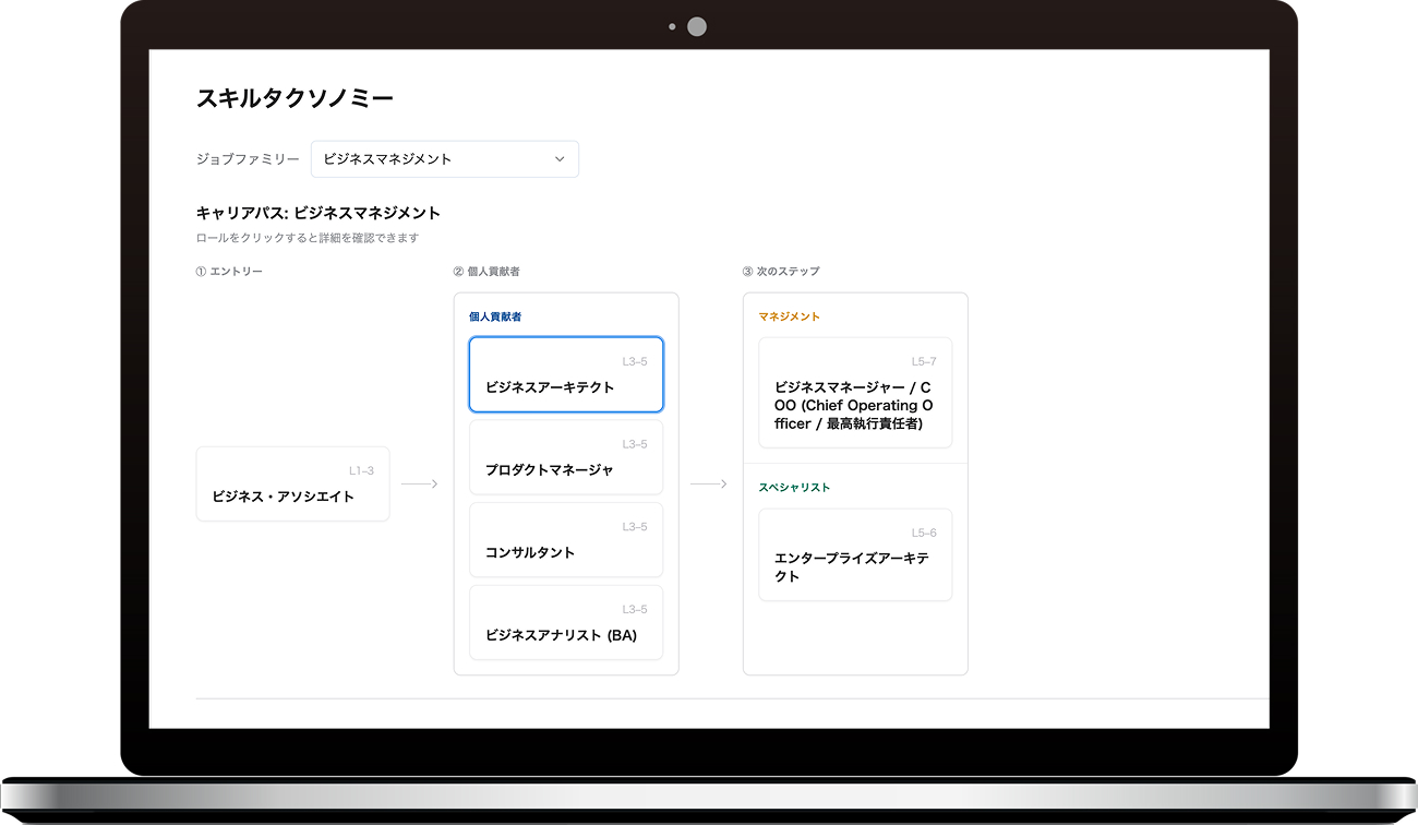 経済産業省「DSS(デジタルスキル標準)」や「iCD」など、信頼性の高い国産標準フレームワークに完全準拠。さらに、技術トレンドの変化に合わせて定義が自動的にアップデートされるため、陳腐化することがありません。職種(ロール)ごとに定義されたスキルマップを、貴社独自のジョブ定義に合わせて柔軟にカスタマイズし、組織全体でブレない評価基準(ものさし)を確立します。