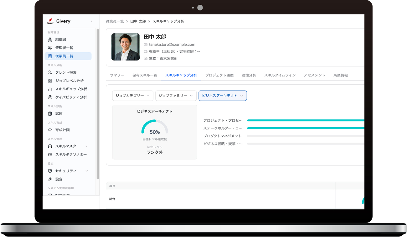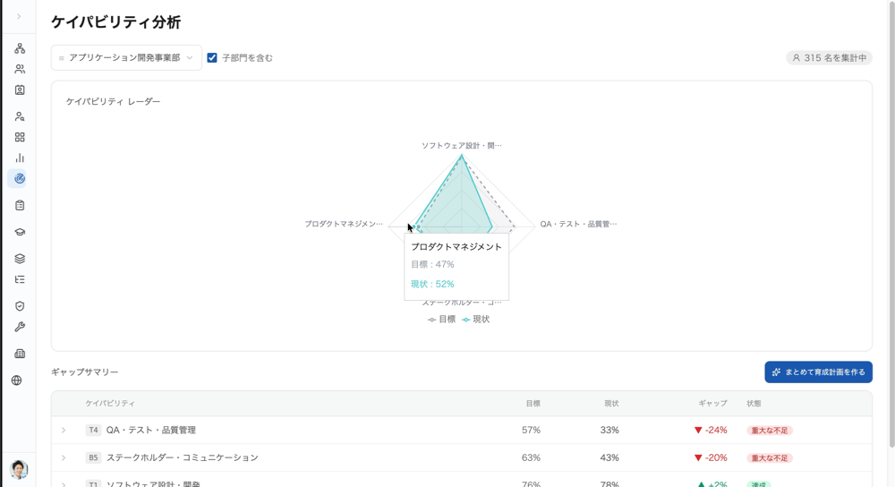経営戦略に必要なスキルと、現状の保有スキルの乖離(ギャップ)を瞬時に特定。感覚的な議論ではなく、データに基づいた採用・育成計画の立案が可能になります。