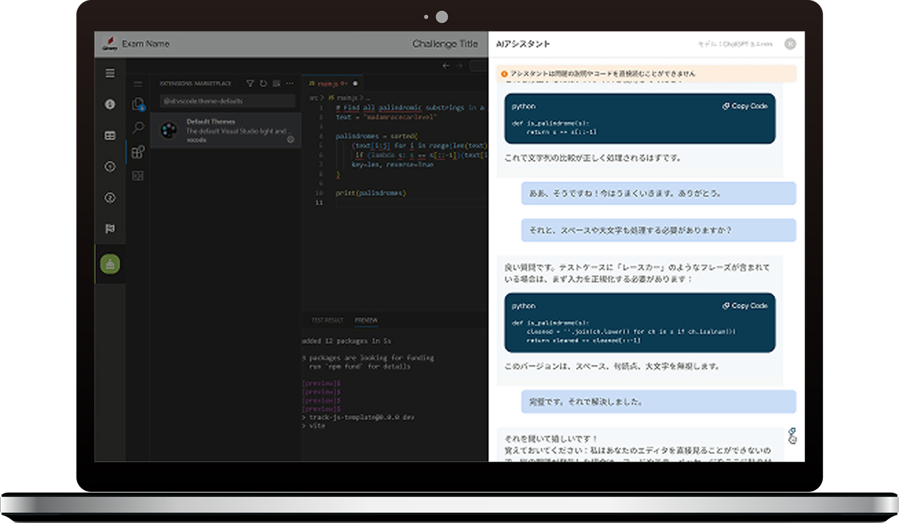 実際の業務環境に近い課題を通じて「生成AI活用スキル」を測定します。実践的なプログラミングに取り組む場合やエンジニアリング以外のワークサンプルテストで、AIの活用力や対話プロセスそのものを分析・評価します。分かりやすさにこだわった独自の評価軸と詳細レポートで、受験者のAI活用力を可視化。受験者に公平なAIモデルをセキュアな環境で提供するため、企業も受験者も安心してご利用いただけます。