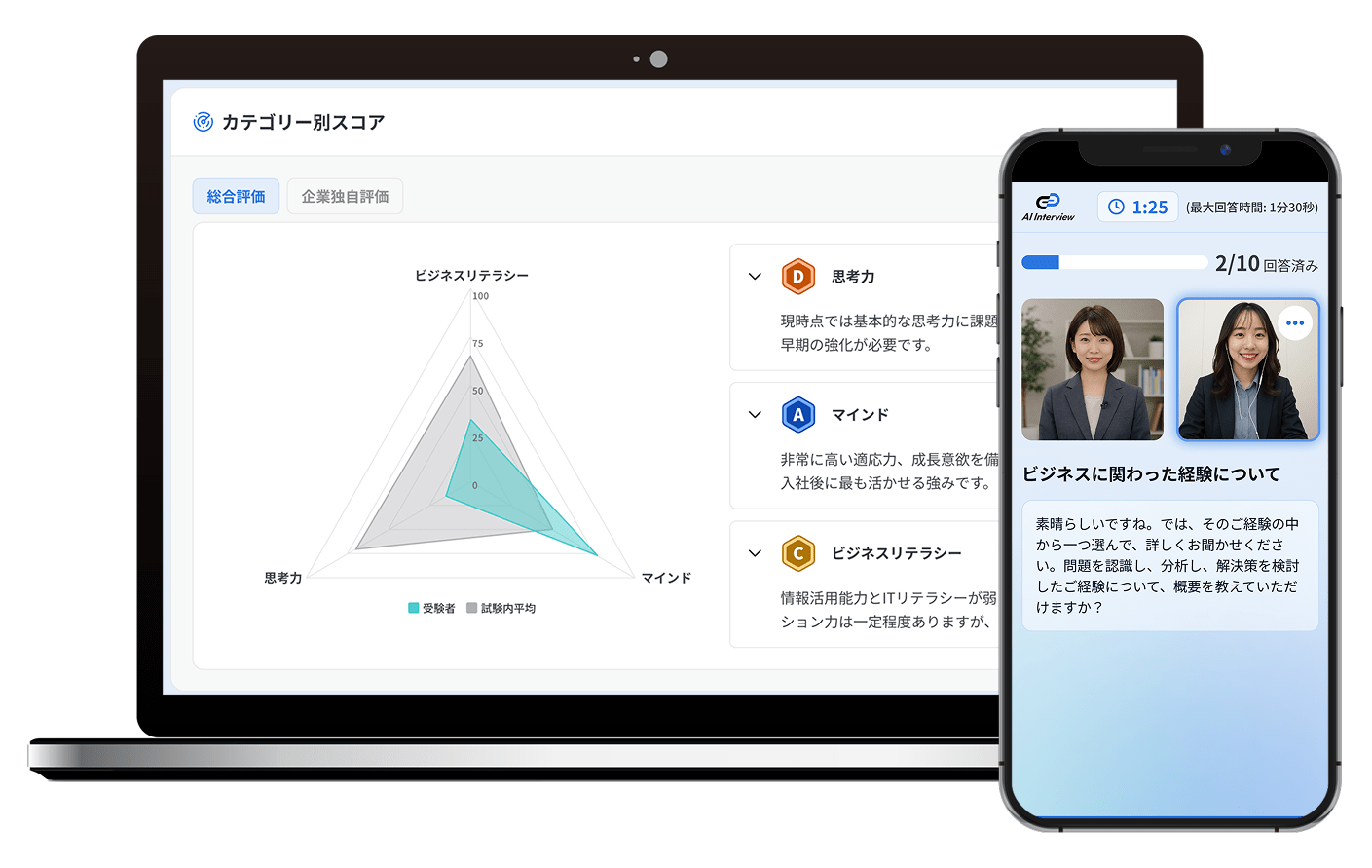 AIがWeb面接を行い、候補者評価に必要な情報を回収し多角的に分析・可視化することで、ES回収と評価、一次面接といった採用選考の初期段階における人事の負担を大きく減らしながら採用の質の向上にも貢献します。