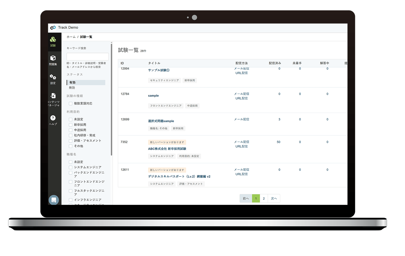 Track Testは、豊富な1000問以上の実践的なデジタルスキルを可視化する問題を組み合わせ、自社独自のアセスメントを簡単に作成・配信します。候補者から提出されたソースコードを自動採点し、レビューができる、業界No.1のスキルアセスメントツールです。