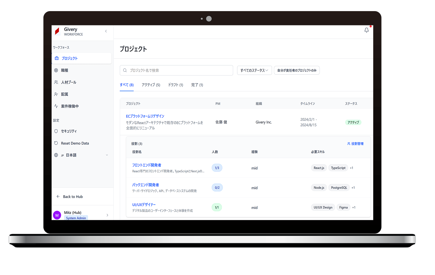 Track Workforce は、従業員の“スキルデータ”を起点に、プロジェクト/JD設計、要員の最適アサインとコスト・利益管理、プロジェクトヘルス&1on1運用までを一体化するワークフォースプランニング基盤です。スキルファーストな意思決定で、人材の配置と生産性を最適化します。