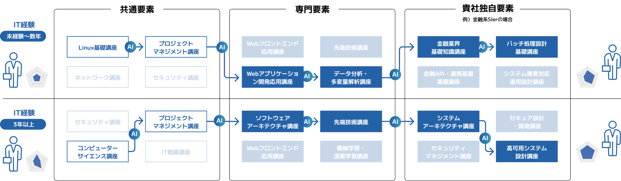 レベルに応じた個別最適ラーニングパスを自動設計。実務に近いプロジェクト研修と連動