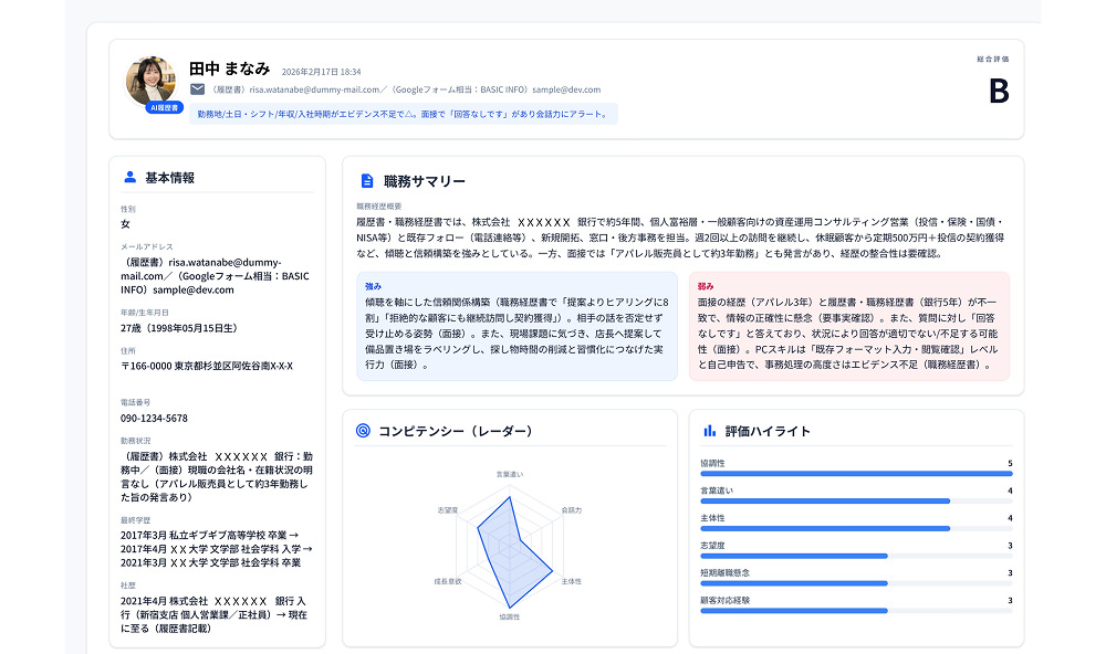 構造化されたAIインタビューを通じて候補者の思考特性や価値観を分析。面接官による評価のばらつきを抑え、一貫性のある採用評価を実現します。