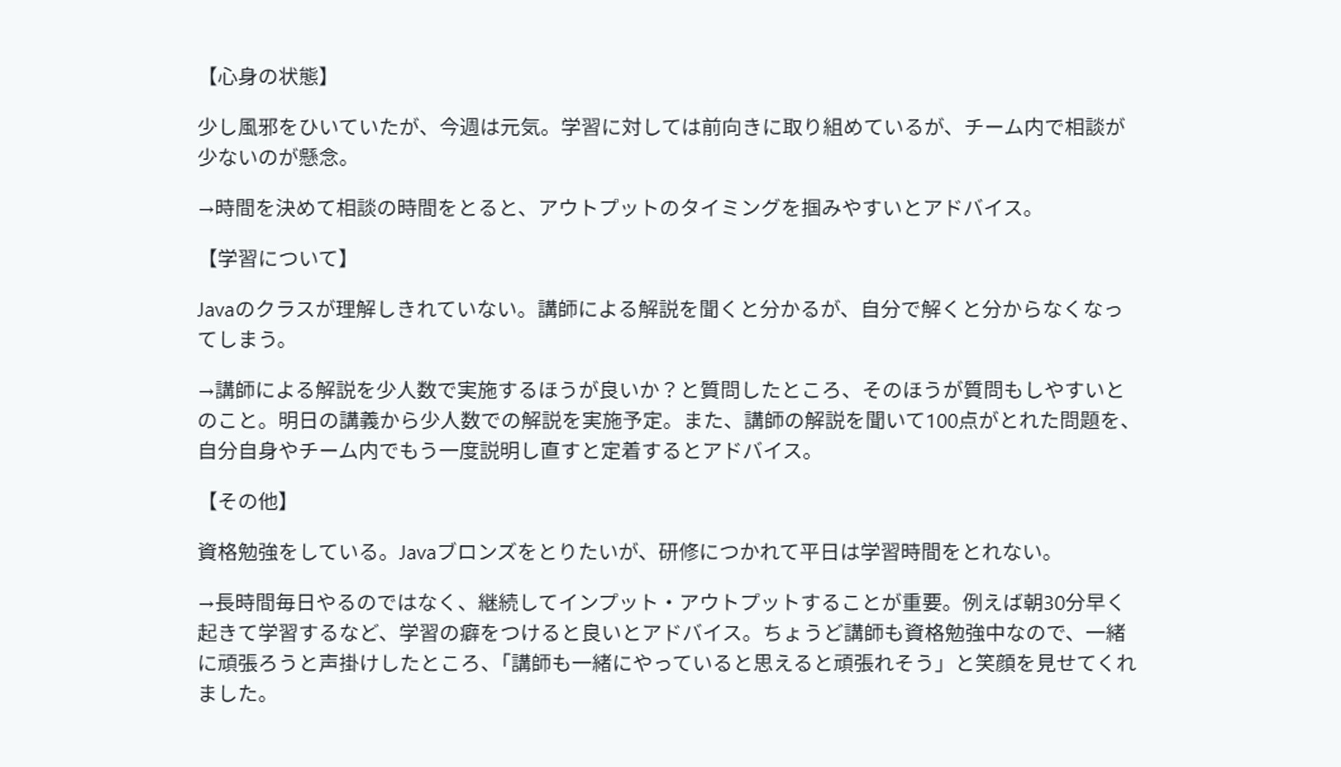 ITスキル以外の面でも丁寧に見ていただき、大変助かりました。また、精神面にも配慮いただいていると感じたため、ある程度任せることが出来ました。